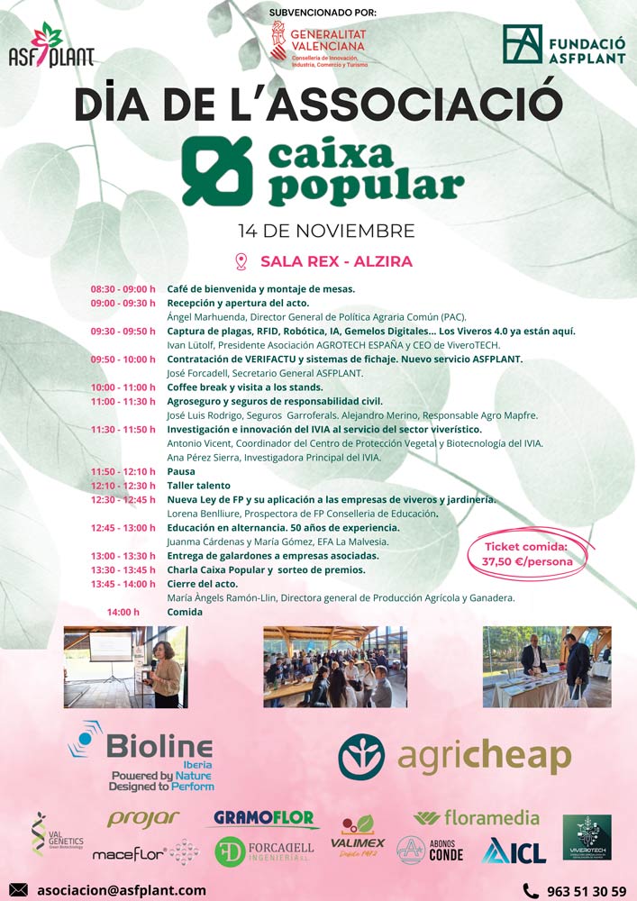 ASFPLANT convoca a sus asociados y asociadas al Dia de l’Associació, que se celebrará el 14 de noviembre en la Sala Rex de Alzira, con el apoyo de Caixa Popular, la Fundació Asfplant y la Conselleria de Agricultura, Agua, Ganadería y Pesca. Podremos vernos de nuevo en esta jornada, que el año pasado no se celebró debido a la tragedia de la DANA.